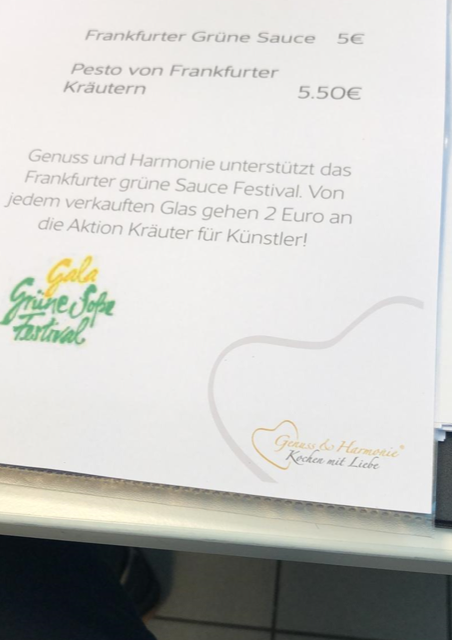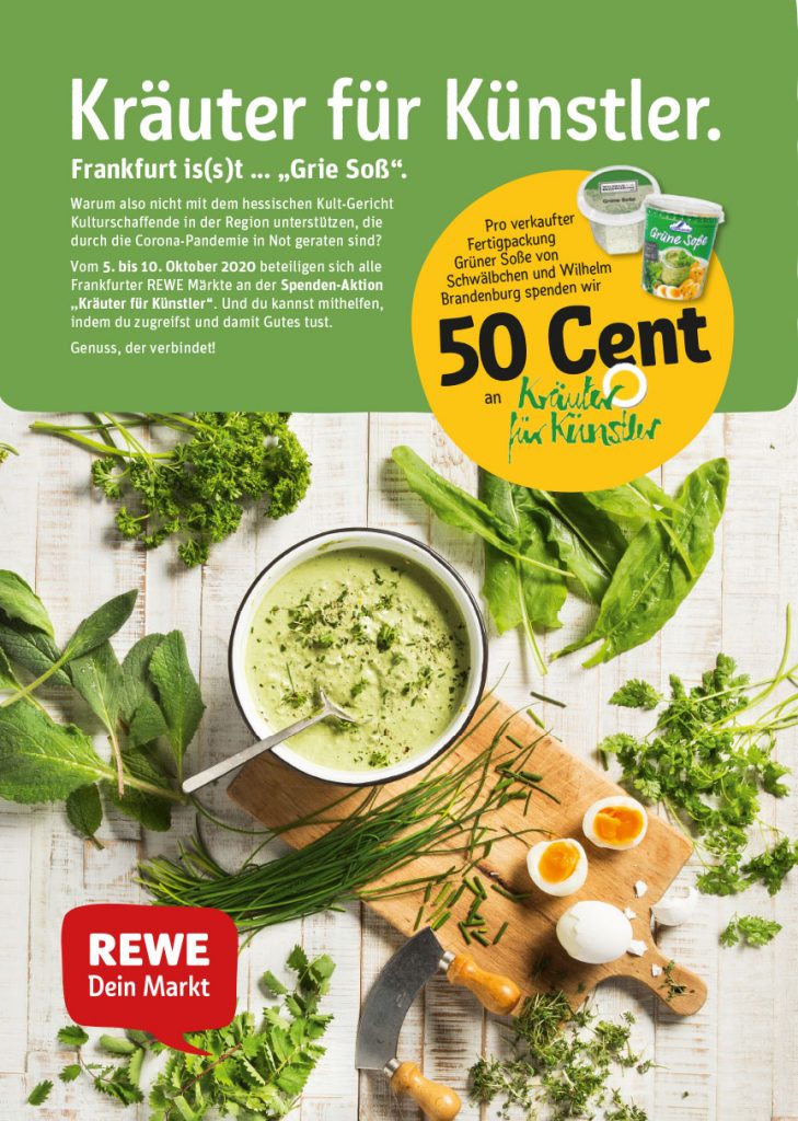 | In der Zeit zwischen den 05.10.2020 – 10.10.2020 spenden alle Frankfurter Rewe-Märkte für jede verkaufte Grüne Soße von Wilhelm Brandenburg und Schwälbchen 0,50 € für “Kräuter für Künstler”.